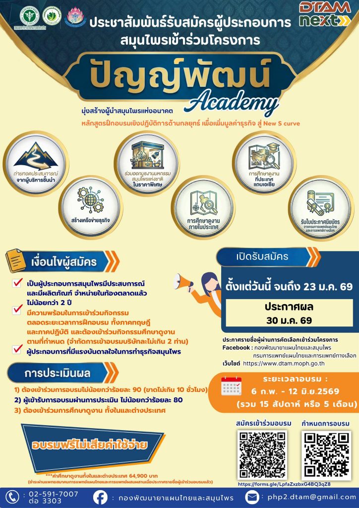 ประชาสัมพันธ์ ขอเชิญผู้ประกอบการสมุนไพรที่มีประสบการณ์ เข้าร่วมโครงการ “ปัญญ์พัฒน์ Academy”