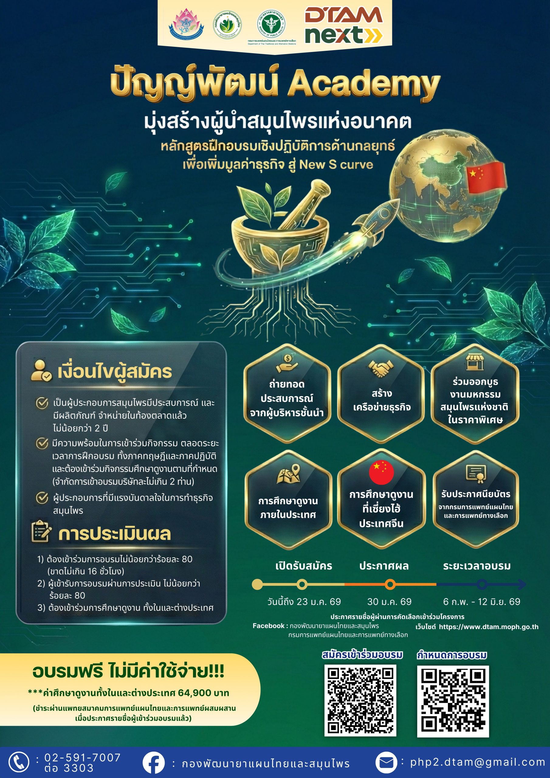 กองพัฒนายาแผนไทยและสมุนไพร ขอเชิญผู้ประกอบการสมุนไพรที่มีประสบการณ์ เข้าร่วมโครงการ “ปัญญ์พัฒน์ Academy” หลักสูตรฝึกอบรมเชิงปฏิบัติการ ที่ออกแบบมาเพื่อเสริมสร้างศักยภาพผู้ประกอบการสมุนไพรอย่างรอบด้าน ทั้งด้านการบริหารจัดการ การตลาด การสร้างเครือข่ายธุรกิจ และการพัฒนาธุรกิจสู่การเติบโตอย่างยั่งยืน (New S-Curve)
