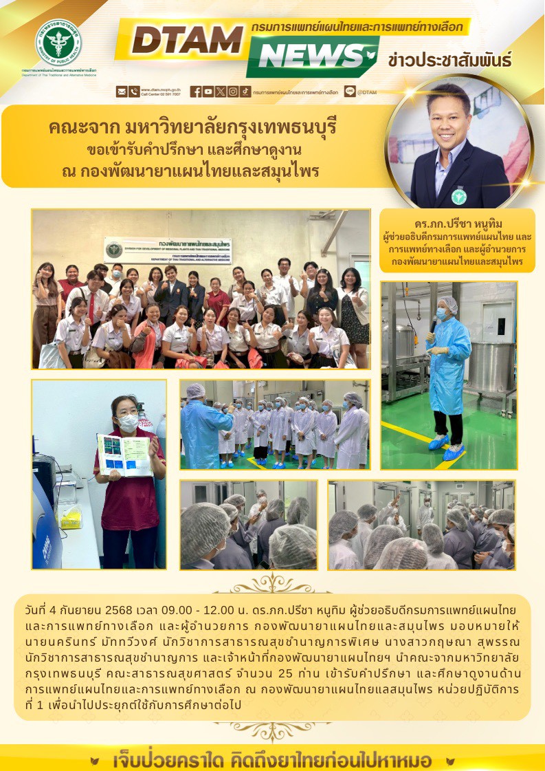 วันที่ 4 กันยายน 2568 เวลา 09.00 – 12.00 น. ดร.ภก.ปรีชา หนูทิม ผู้ช่วยอธิบดีกรมการแพทย์แผนไทย และการแพทย์ทางเลือก และผู้อำนวยการ กองพัฒนายาแผนไทยและสมุนไพร มอบหมายให้ บายนครันทร์ มักกวีวงศ์ นักวิชาการสาธารณสุขชำนาญการพิเศษ นางสาวกฤษณา สุพรรณ นักวิชาการสาธารณสุขชำนาญการ และเจ้าหน้าที่กองพัฒนายาแผนไทยฯ นำคณะจากมหาวิทยาลัย กรุงเทพธนบุรี คณะสาธารณสุขศาสตร์ จำนวน 25 ท่าน เข้ารับคำปรึกษา และศึกษาดูจาดูงานด้าน การแพทย์แผนไทยและการแพทย์ทางเลือก ณ กองพัฒนายาแผนไทยแลสุนไพร หน่วยปฏิบัติการ ที่ 1 เพื่อนำไปประยุกต์ใช้กับการศึกษาต่อไป