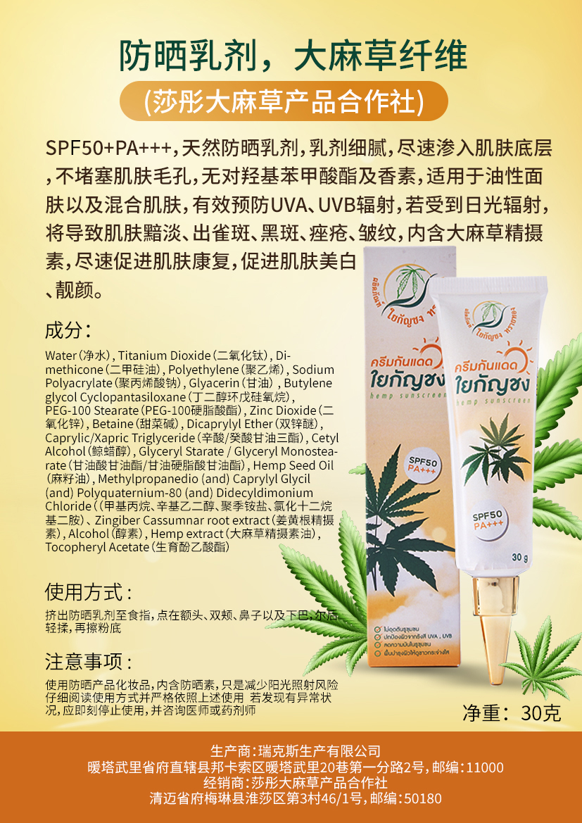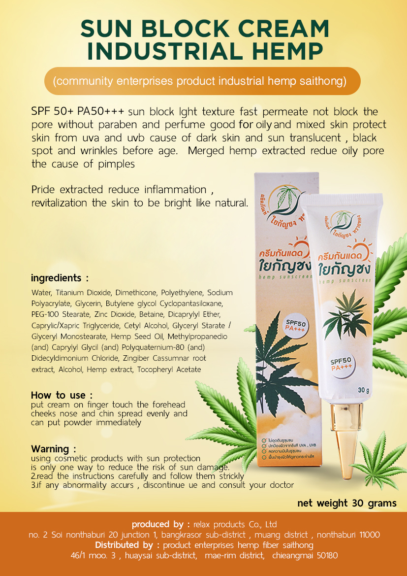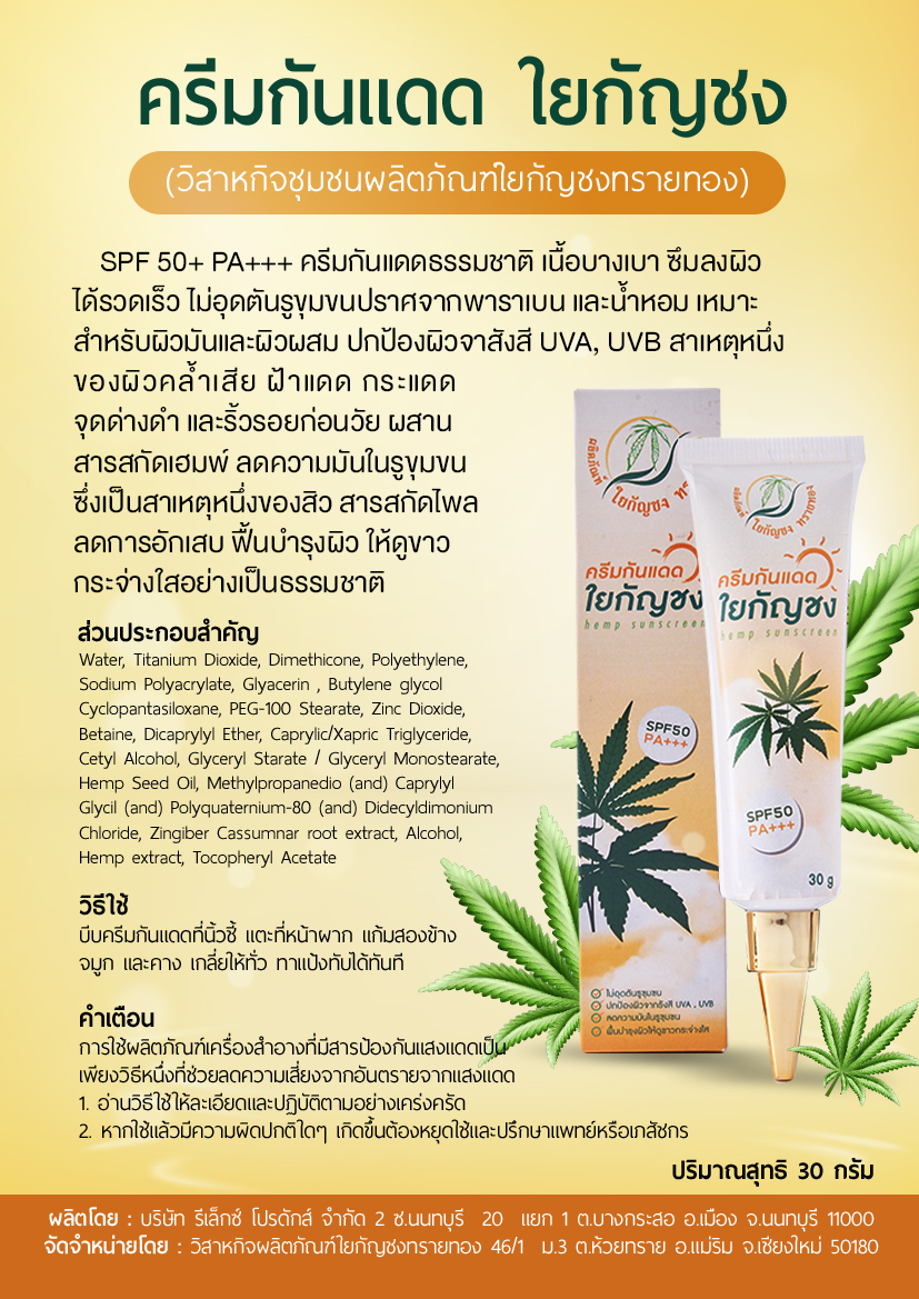 SPF 50+ PA++++ ครีมกันแดดธรรมชาติ เนื้อบางเบา ซึมลงผิว ได้รวดเร็ว ไม่อุดตันรูขุมขนปราศจากพาราแบน และน้ำหอม เหมาะ สำหรับผิวมันและผิวผสม ปกป้องผิวจาสังสี UVA, UVB สาเหตุหนึ่ง ของผิวคล้ำเสีย ฝ้าแดด กระแดด จุดด่างดำ และริ้วรอยก่อนวัย ผสาน สารสกัดเฮมพ์ ลดความมันในรูขุมขน ซึ่งเป็นสาเหตุหนึ่งของสิว สารสกัดไพล ลดการอักเสบ ฟื้นบำรุงผิว ให้ดูขาว กระจ่างใสอย่างเป็นธรรมชาติ
